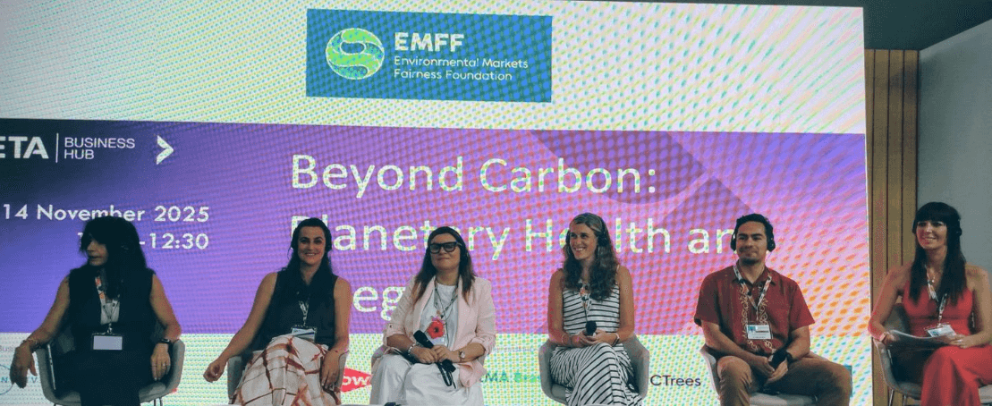 On November 14, during COP30 in Belém, Brazil, we participated in the panel Beyond Carbon: Planetary Health and Integrity, held at the IETA Business Hub — whom we warmly thank for hosting the session. Moderated by Patricio Lombardi, the discussion explored the interdependence between nature, health, and development, underscoring that climate action cannot be reduced to carbon metrics alone.